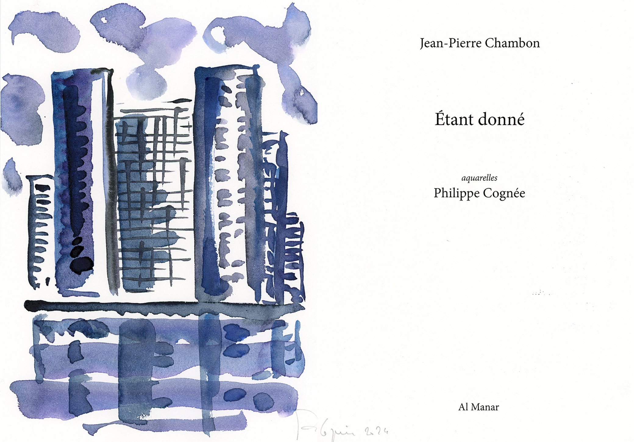 Frontispice :"Étant donné". Poèmes de Jean-Pierre Chambon,. 30 exemplaires de tête sur BFK Rives d’Arches, 116 pages au format 17,5 x 23 cm, chacun rehaussé de deux aquarelles originales de Philippe Cognée. Prix Roger-Kowalski de la Ville de Lyon.
