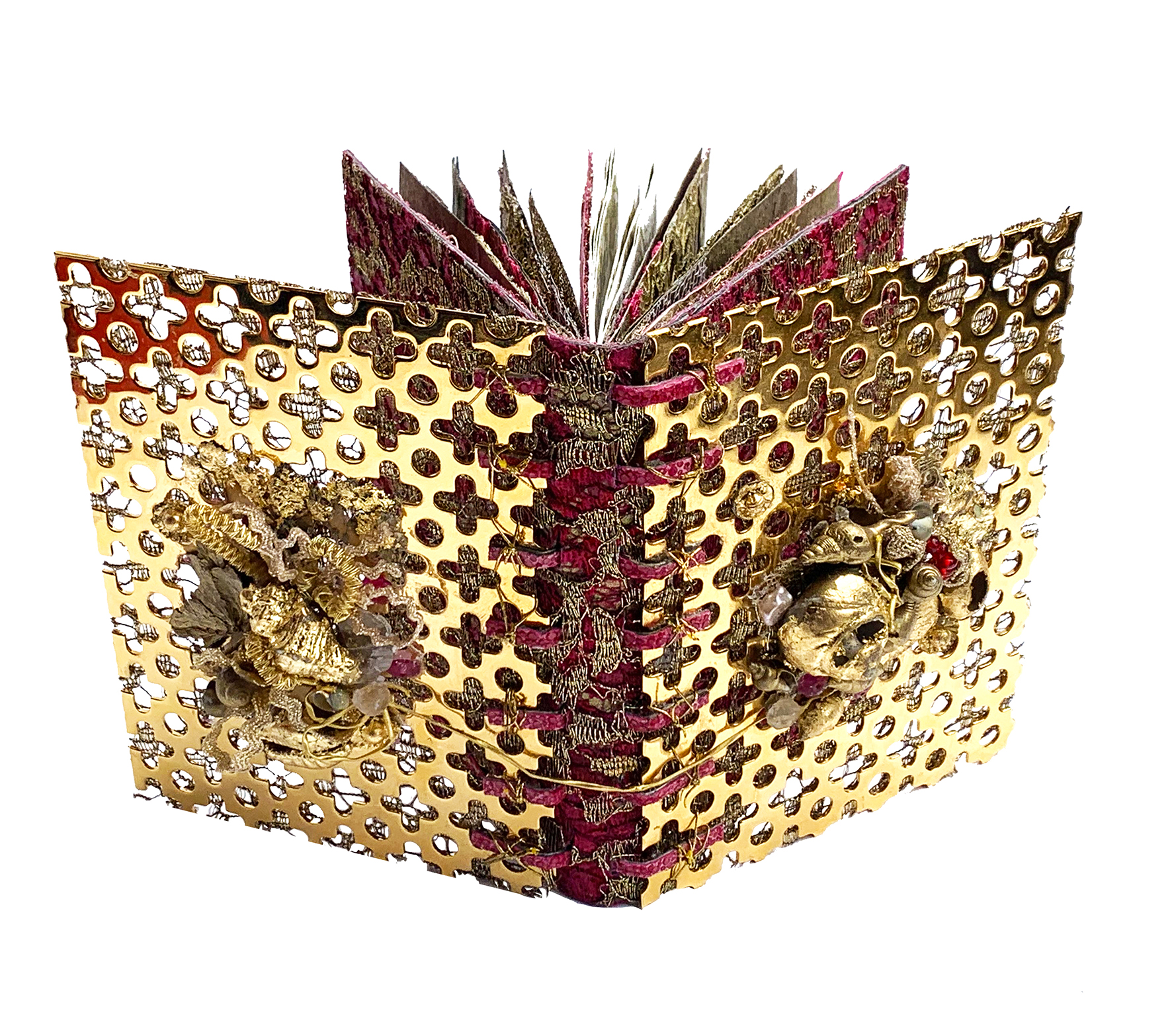 Mots d’amour - Quatre sonnets - Shakespeare, Éd. les Reines, Rennes, 2023, ex. n° 2/5. Grilles plaquées or, dentelles, fleurs et coquillages dorés à la feuille d’or, cannetilles d’or, rubis et grenats. Quatre sonnets d’amour de William Shakespeare, présentés dans leur ver- sion originale anglaise accompagnée de leur dernière traduction française. Plats composés de grilles ajourées plaquées or, diffractant la lumière et laissant affleurerdes profondeurs rouge, évoquant l’intensité du sentiment amoureux, la pulsation du désir... Gardes en papier Japon teint, enrichies de dentelles de Caudry et de dentelles anciennes. Des éléments végétaux dorés à la feuille d’or prolongent cette écriture. Compositions en relief mêlant rubis et coquillages dorés à la feuille d’or, pour créer un dialogue entre éclat minéral et sensualité organique.