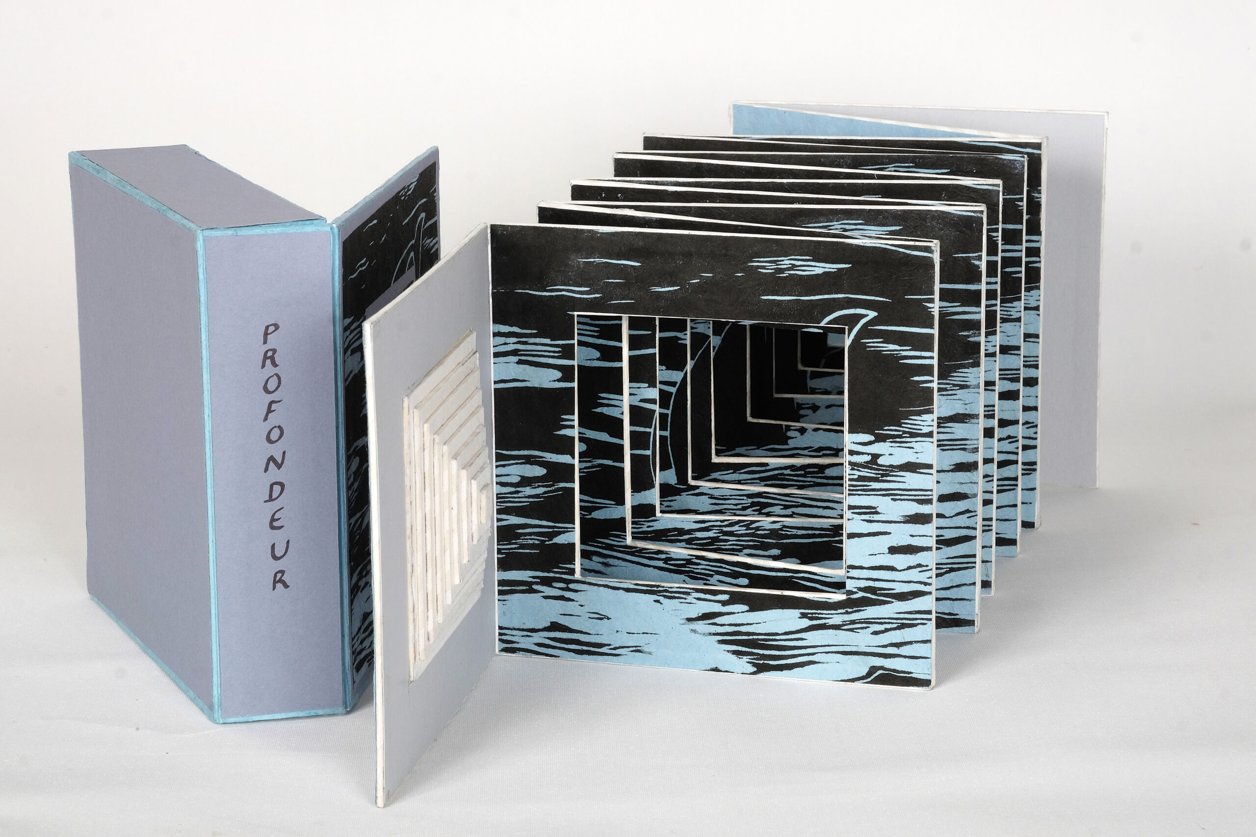 Profondeur. Leporello en tirage unique sans texte au format 16 x 16,5 cm. Édition: Hélène Baumel. Sur le thème Double Je(eu), découverte de fenêtres de plus en plus petites en marouflant un détail de la gravure sur chaque fenêtre. En maintenant le livre sur la tranche on découvre la totalité de la gravure et sur le dos de la couverture on découvre une pyramide collée.