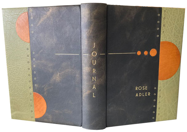 Journal de Rose Adler : Reliure traditionnelle plein cuir ( veau teinté, buffle et vachette). Mosaïque de vachette et décor au film noir et à l’or. Titrage par Patrick Prouteau.