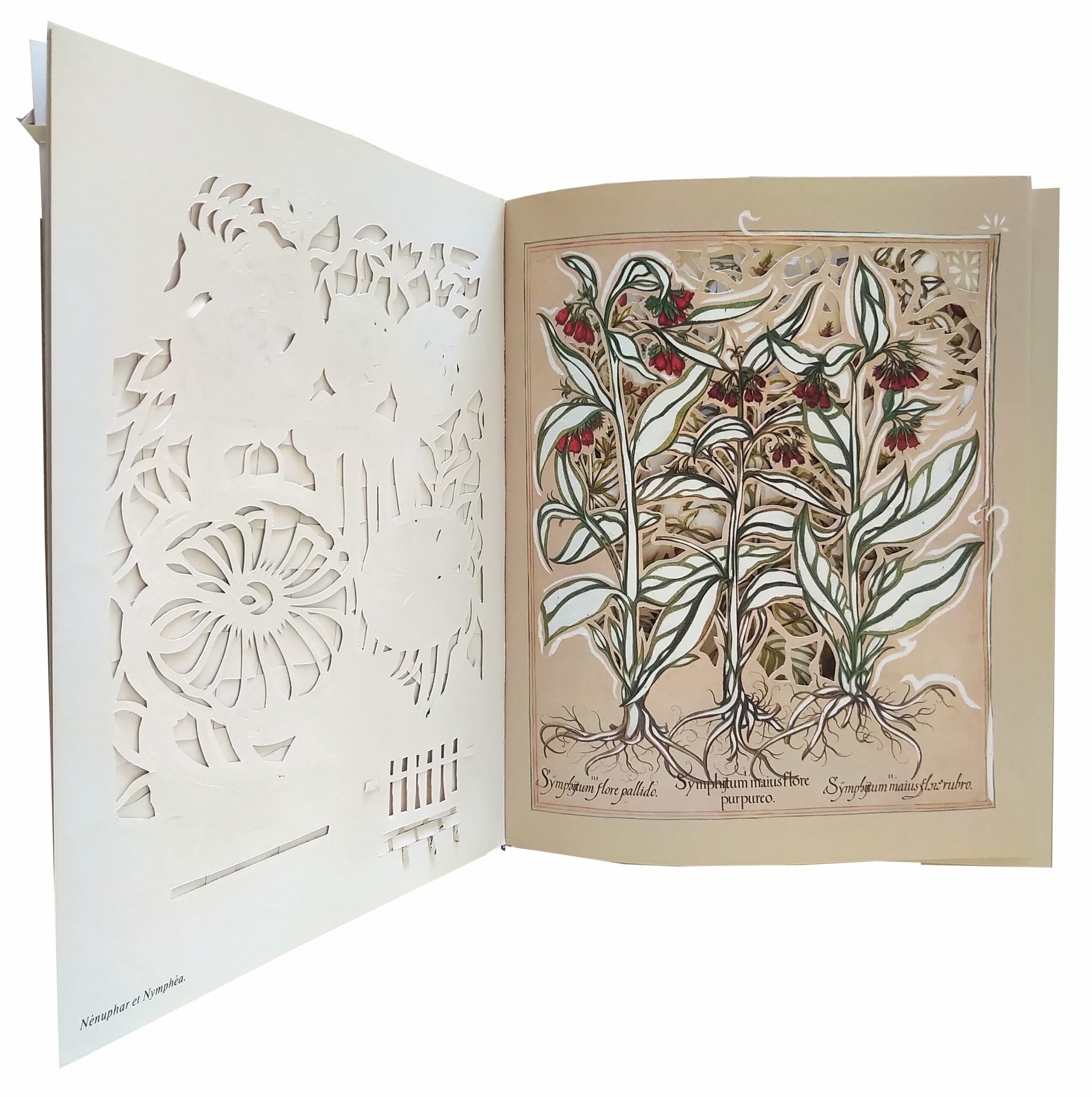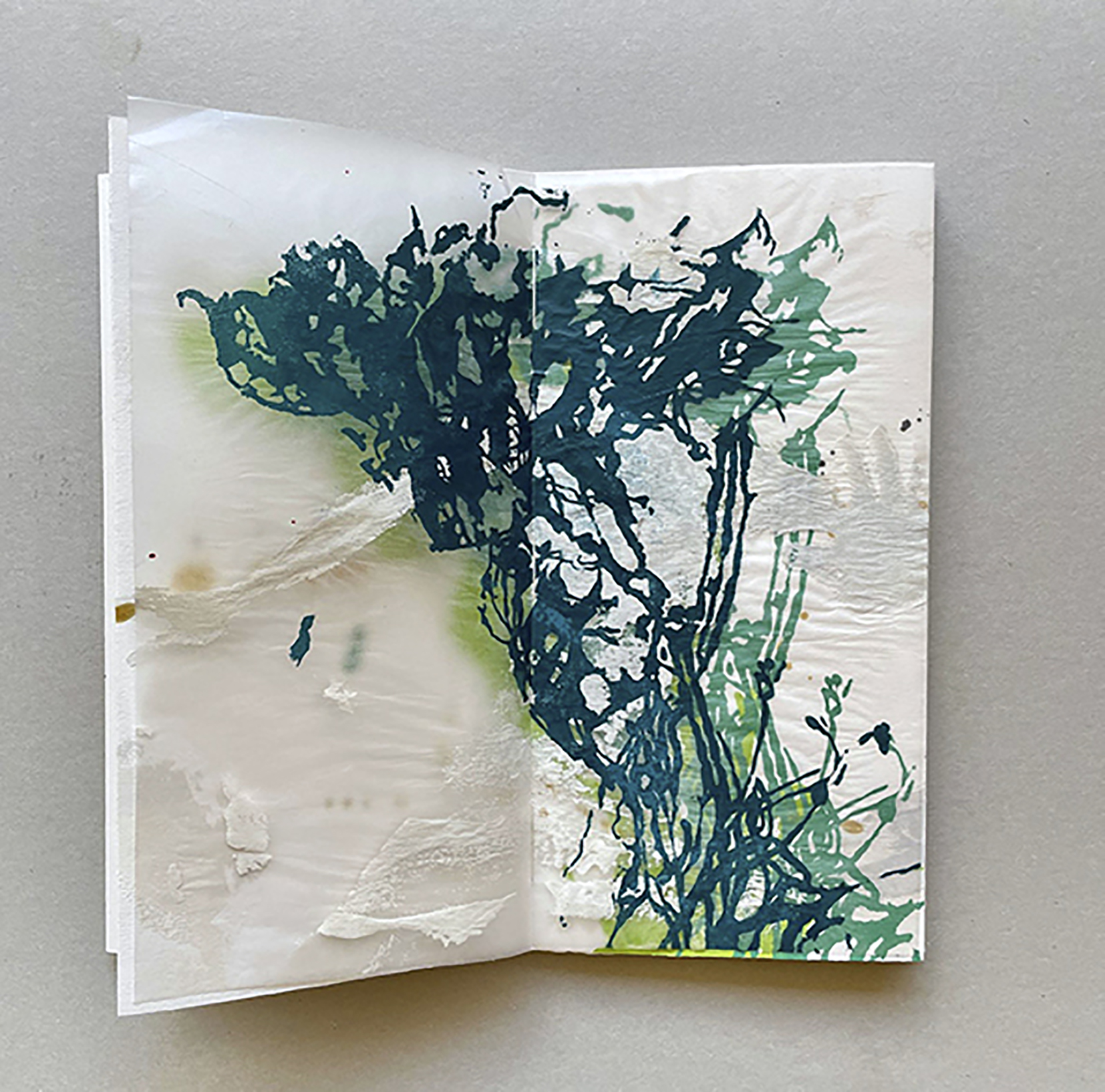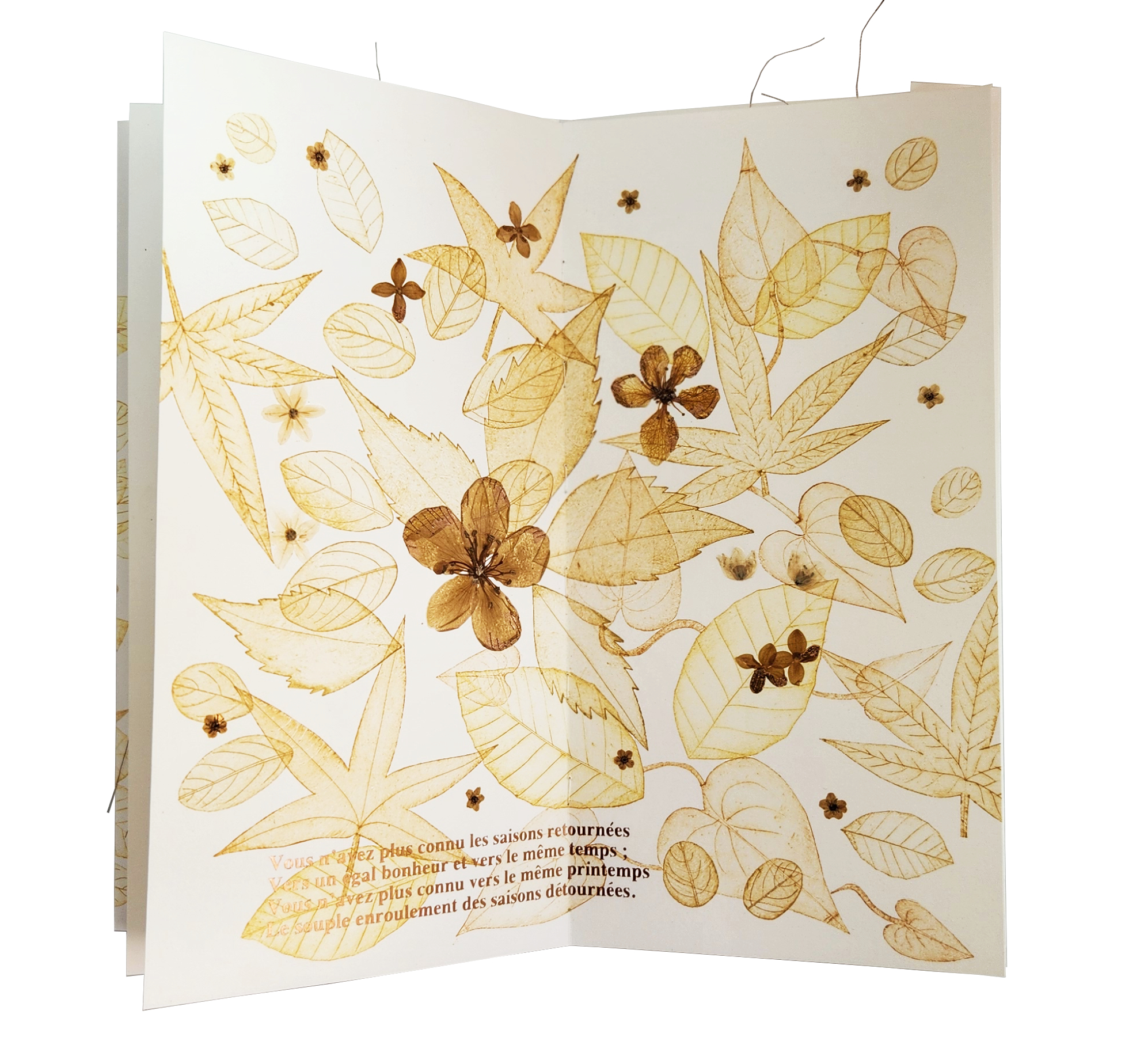 Livre unique. Texte de Charles Péguy extrait de «Ève», achevé d’imprimer en septembre 2025, sur papier Fabriano. Impression de carton gravé, collage de fleurs, application de feuille de cuivre, application de mica et broderies. Texte flex thermocollé.