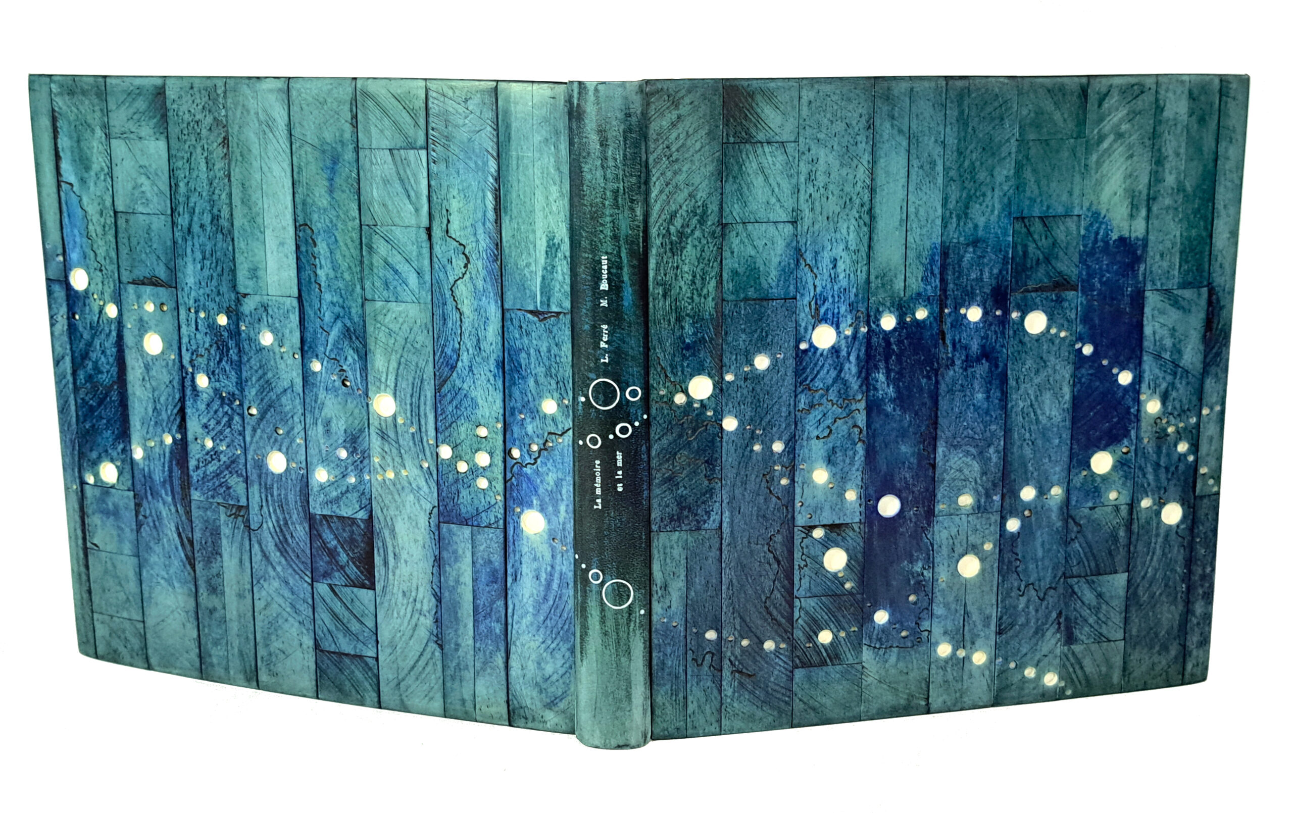 « La mémoire et la mer », édition Le libre feuille, 2016, format relié 206 x 214 mm. Bradel à plats rapportés, dos en parchemin teinté pour correspondre au décor, plats articulés en os (bovin) teinté, gravé et percés. Gardes en croûte de cuir. Dorure au film oeser blanc.