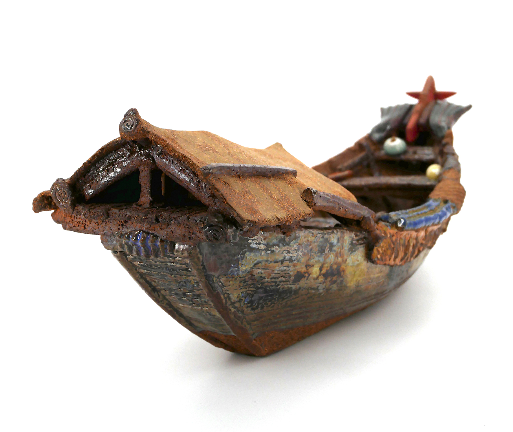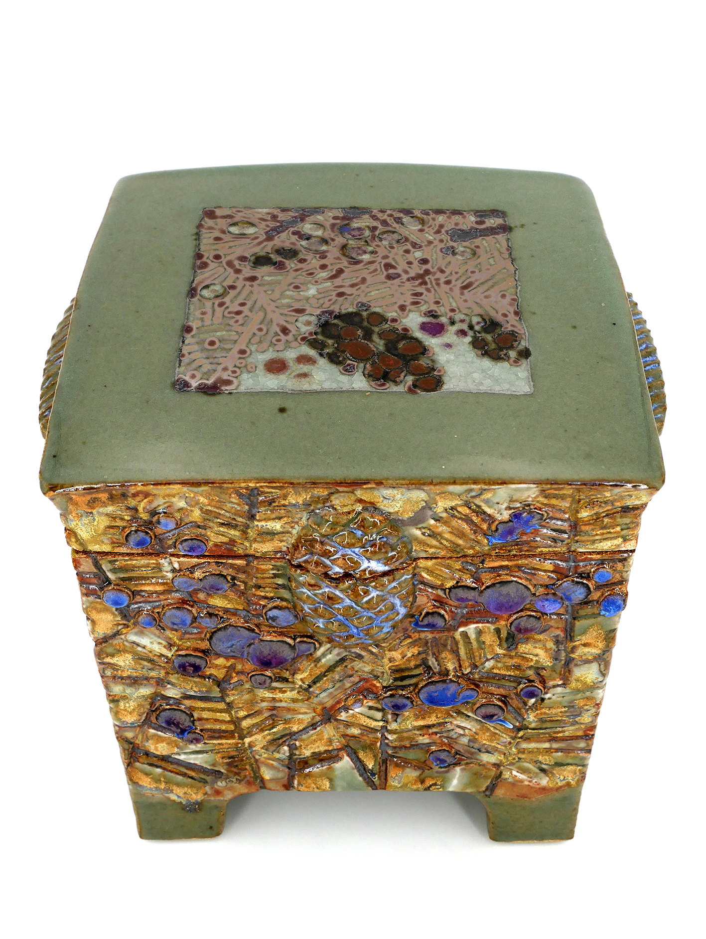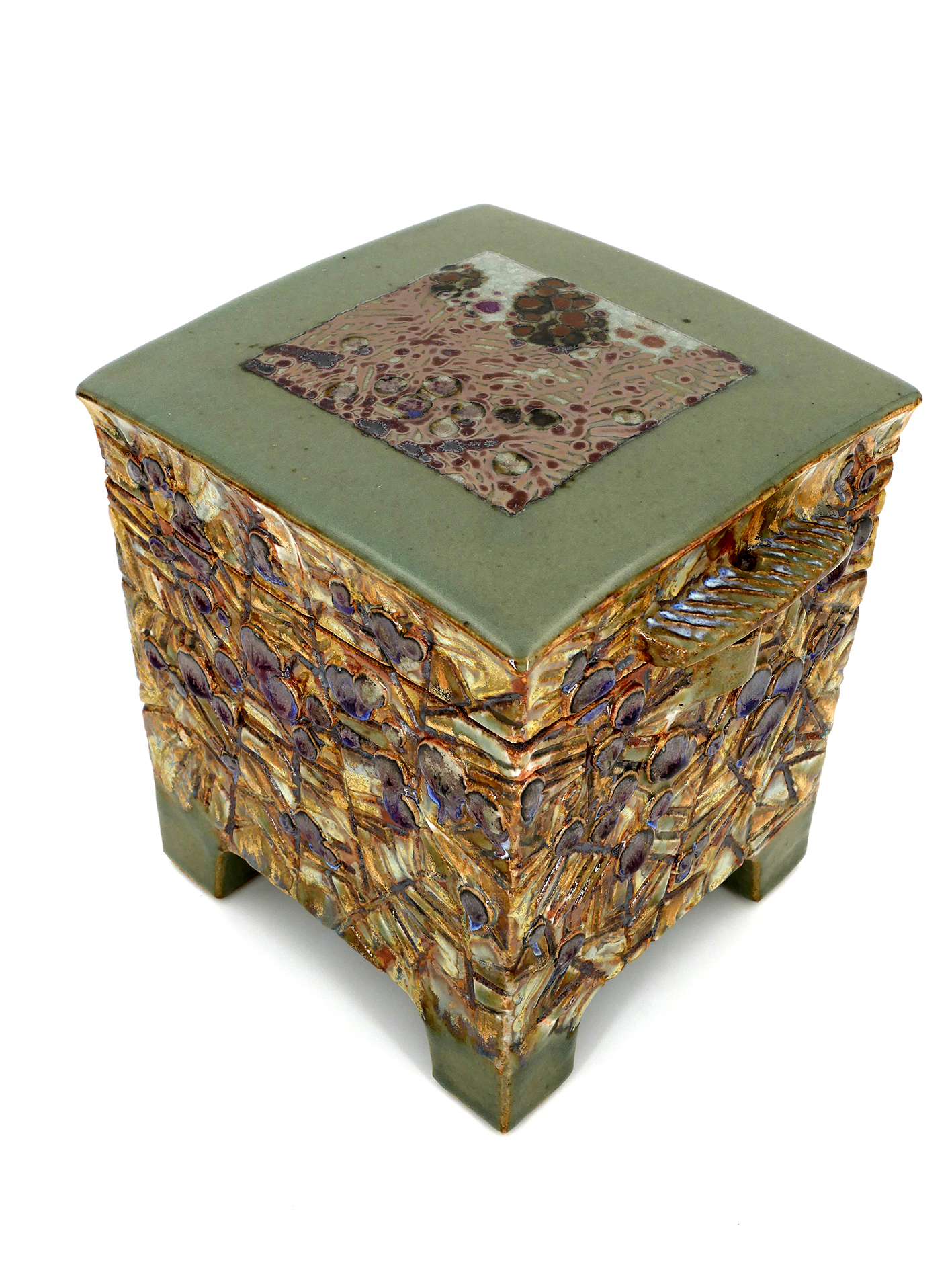 Techniques : Coffre céramique en grès, modelé, gravé, émaillé, cabochon, feuille d’or carrée sur le couvercle, superpositions d’émaux en couches – Réserves à la cire – Décors au pinceau
