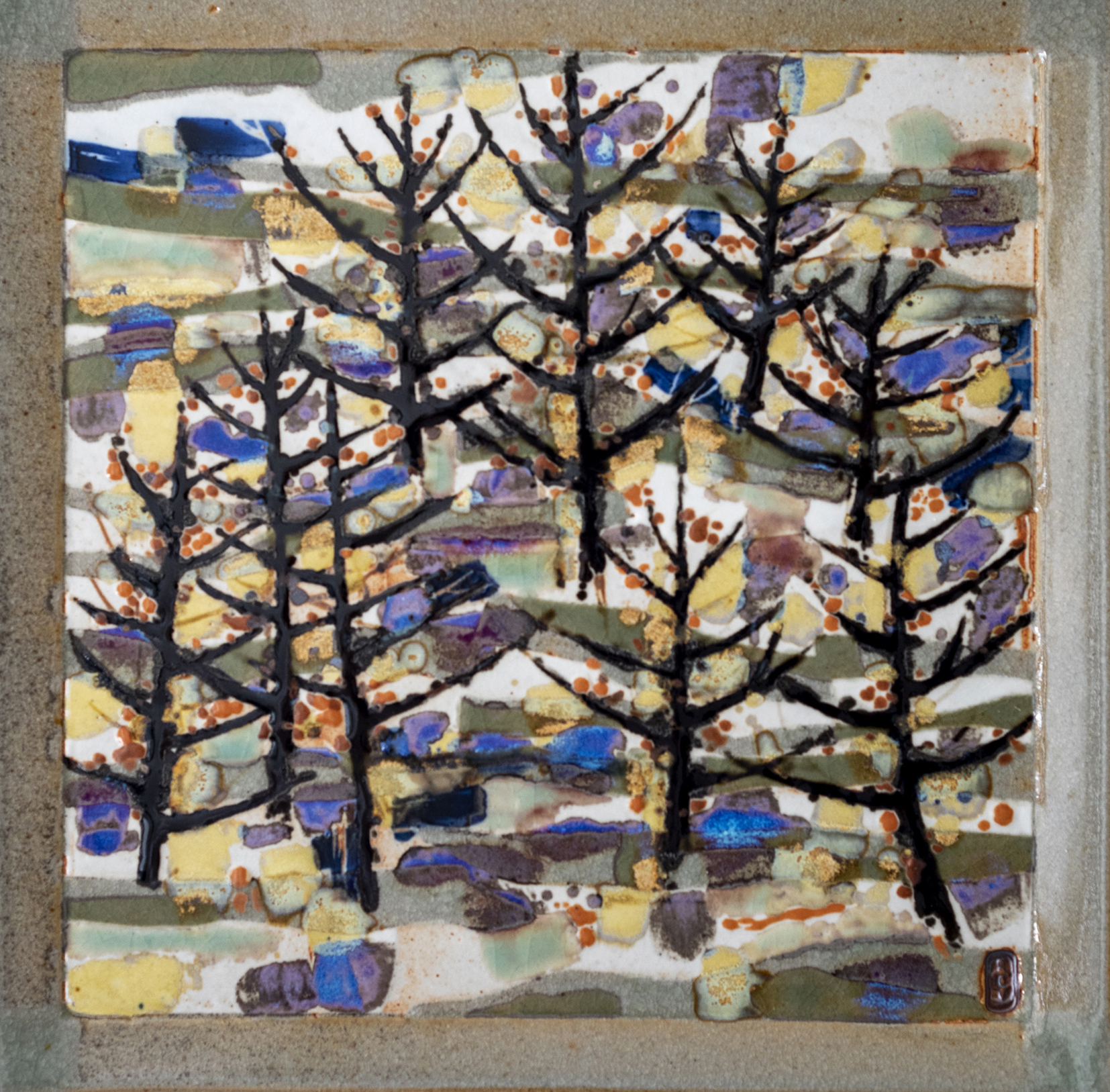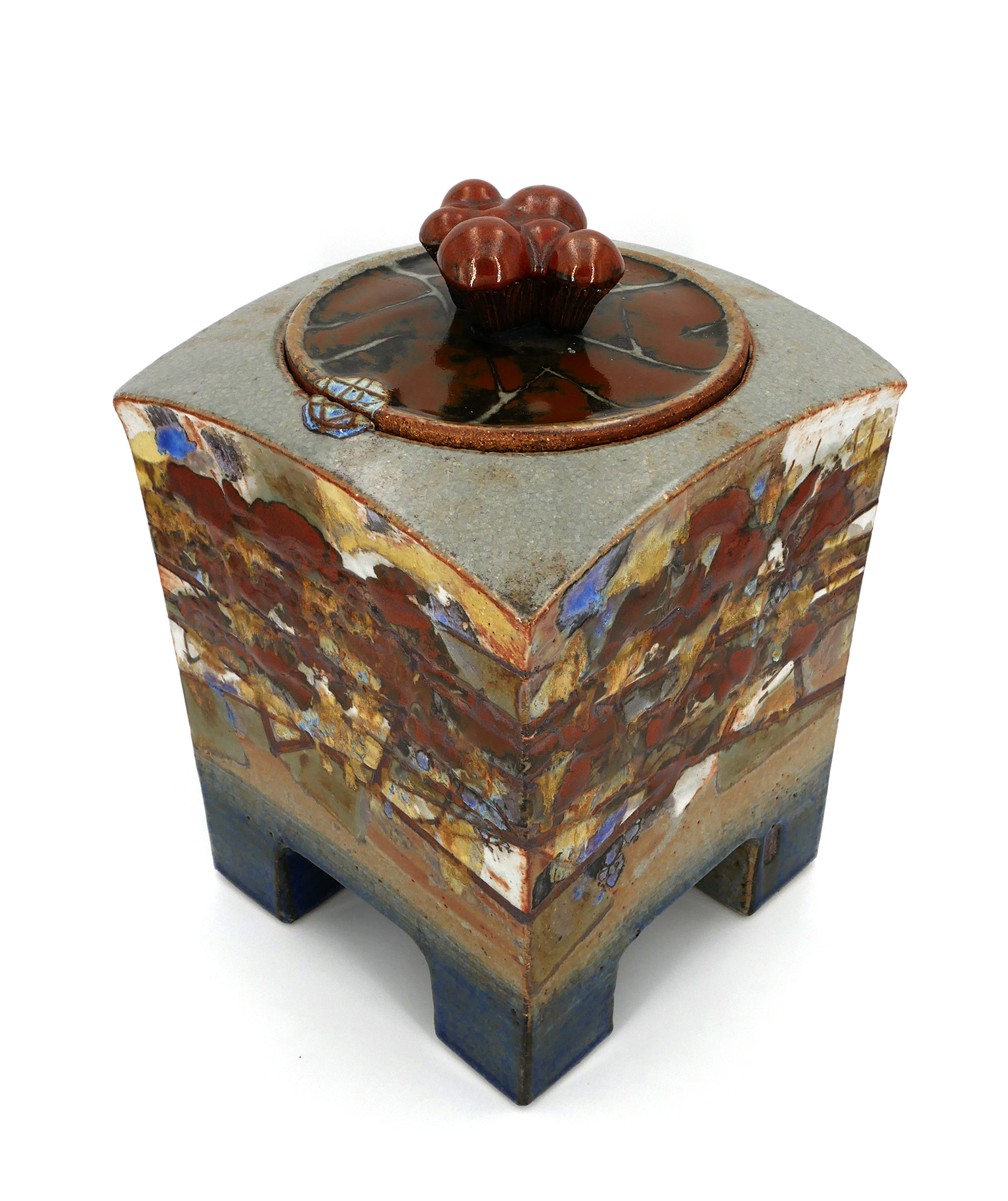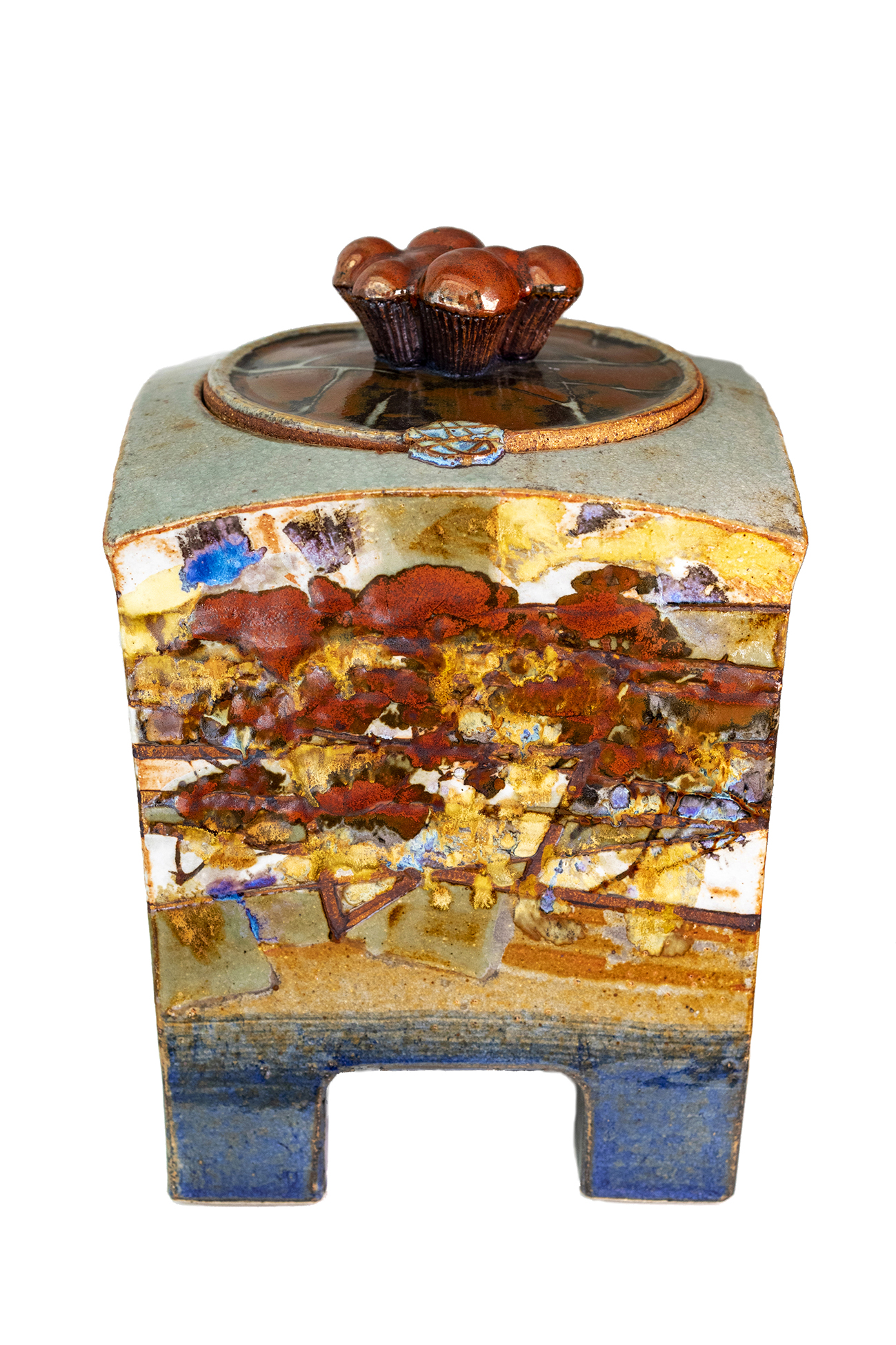 Coffre « Sidérites » - Jean-Claude Canonne – 2005 - Boîte parallélépipédique en grès émaillé, aux faces évoquant des paysages sidériques (minerais de fer) arbres aux camaïeux orangés, atmosphères aux phosphores de fer. « Boîte à usages pour y confier secrets et objets précieux, carnets de poésie et de voyages. Construit dans l’idée d’un abri intime ».
